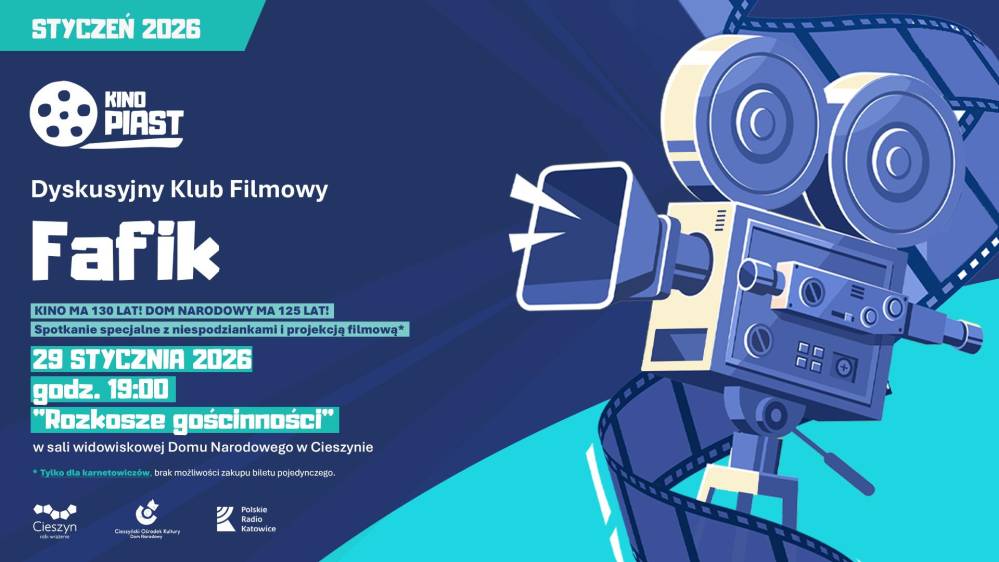 Zapraszamy na specjalną edycję Dyskusyjnego Klubu Filmowego FAFIK z okazji 130-lecia kina i 125-lecia Domu Narodowego! Spotkanie 29 stycznia odbędzie się wyjątkowo o godzinie 19:00, a wejście jest możliwe wyłącznie z karnetami miesięcznymi, które będą w sprzedaży online od 2 do 8 stycznia na stronie: https://tinyurl.com/cokbilety