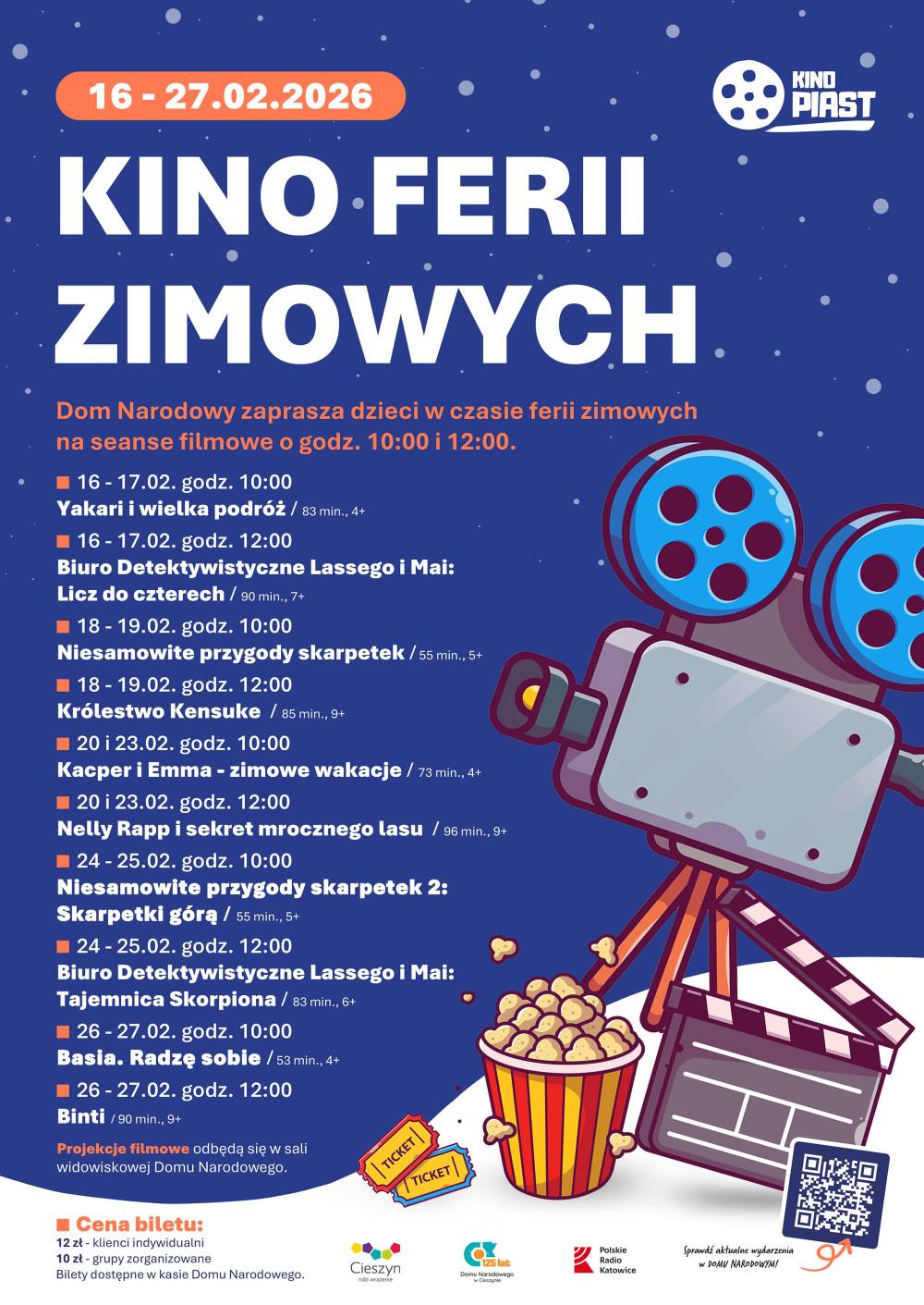 Seanse będą się odbywały w sali widowiskowej Domu Narodowego w Cieszynie, od poniedziałku do piątku o godz. 10:00 oraz 12:00. Repertuar został dobrany z myślą o różnych grupach wiekowych dzieci i obejmuje wartościowe, popularne oraz edukacyjne filmy animowane i fabularne.