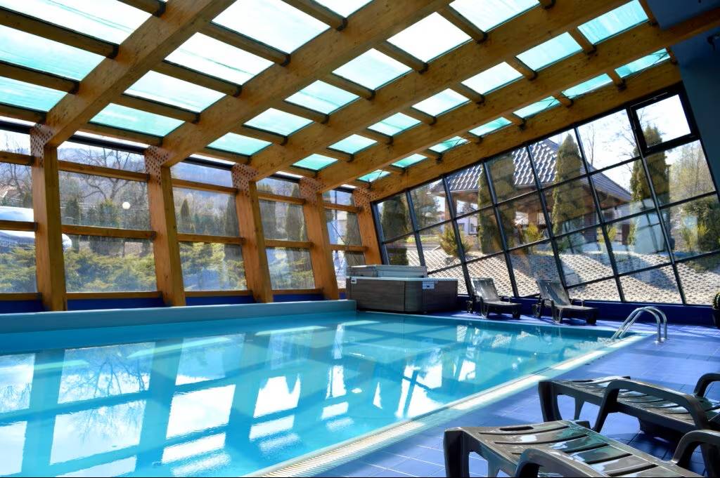• wewnętrzny – podświetlony z przeciwprądem i hydromasażem o powierzchni 55 m2 i głębokości od 80–130 cm.